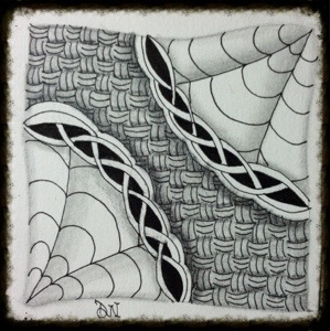 The lightest plane, therefore appearing the closet, I used a new tangle called Chainging. The second plane, or second lightest shade I used another new tangle called Dyon. Last, but not least, I incorporated a pattern I have used before called Keeko. Keeko was used for the third and darkest plane.
