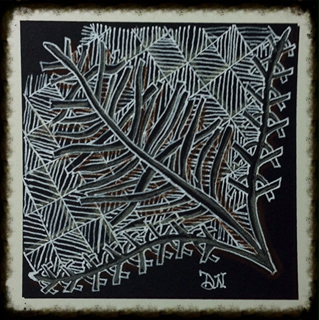 Anyway, to round out this tile I was encouraged to use the more geometric new tangle called “Yincut” which stands out against the organic forms. On a whim, I decided I would create this tile using white ink on black paper. I played around with shading on this tile by using a cream colored shading pencil and sepia brown toned pastel pencil. The deeper chocolate pastel pencil created more depth and gave the selected areas more vibrancy.