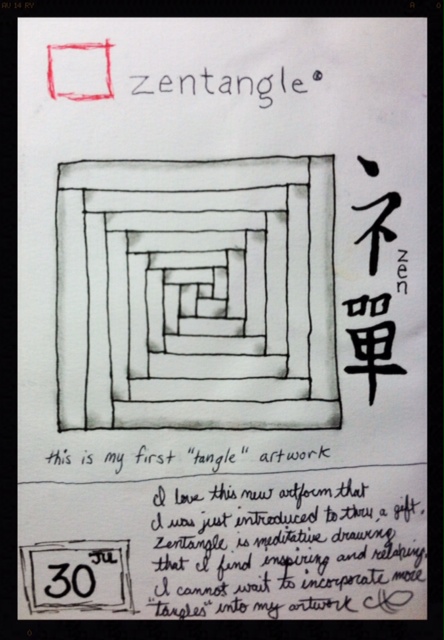 Anyway, this journal page was dedicated to the first tangle I learned called “Cabin Floor”. The pattern was very easy to learn and draw on my own. It totally started me down the tangling path. At the time, I thought it would be great to include Chinese characters in my journal page that mirrored the mood I was in when I drew it. I chose the word “zen” since that was the feeling that was evoked when creating it.