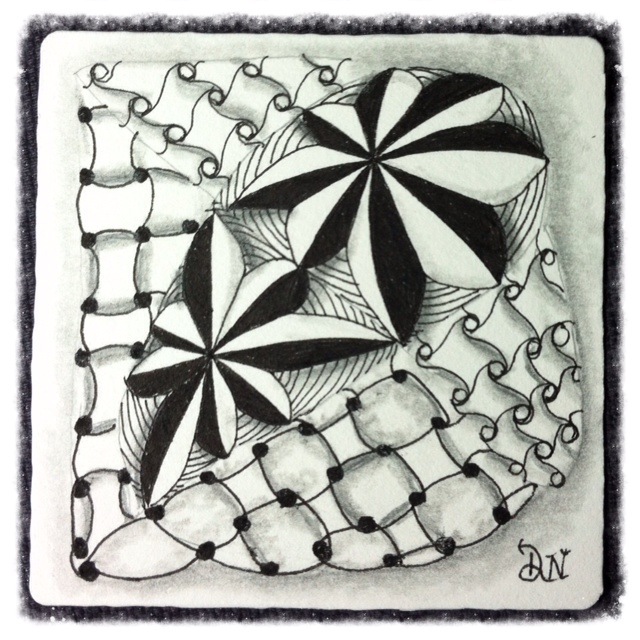 I think my brain went on vacation as I was drawing this tangle. I am fairly sure I created a least two new patterns, neither of which were the elusive Huggins pattern I was trying to draw.