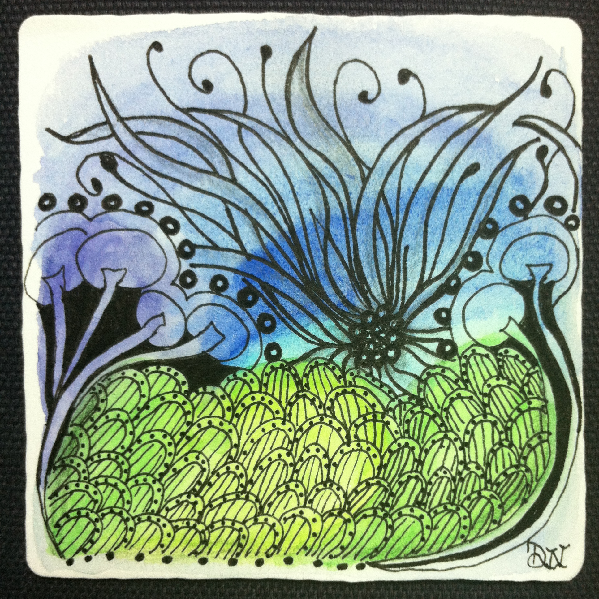 The other newly learned tangle you see used is called ” Taghpodz” which is the very detailed leaf-like pattern seen in the tile. To pull it all together I decided to add “Squid” to fill in the open area of the tile. Despite all the pen-work, it is really the color that is the star of this piece and really enjoyed creating this one. We’ll just have to see what tomorrow will bring- maybe more color?
