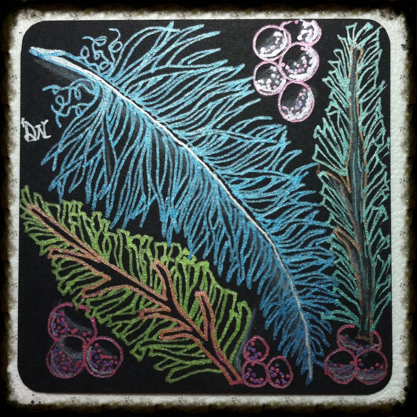 I set out to draw my feather and then added Verdigough with some berries around the tile. I just love how the metallic pens seem to glow off the black paper. This is definitely one of my new favorite techniques that I will be sure to use again in the future.