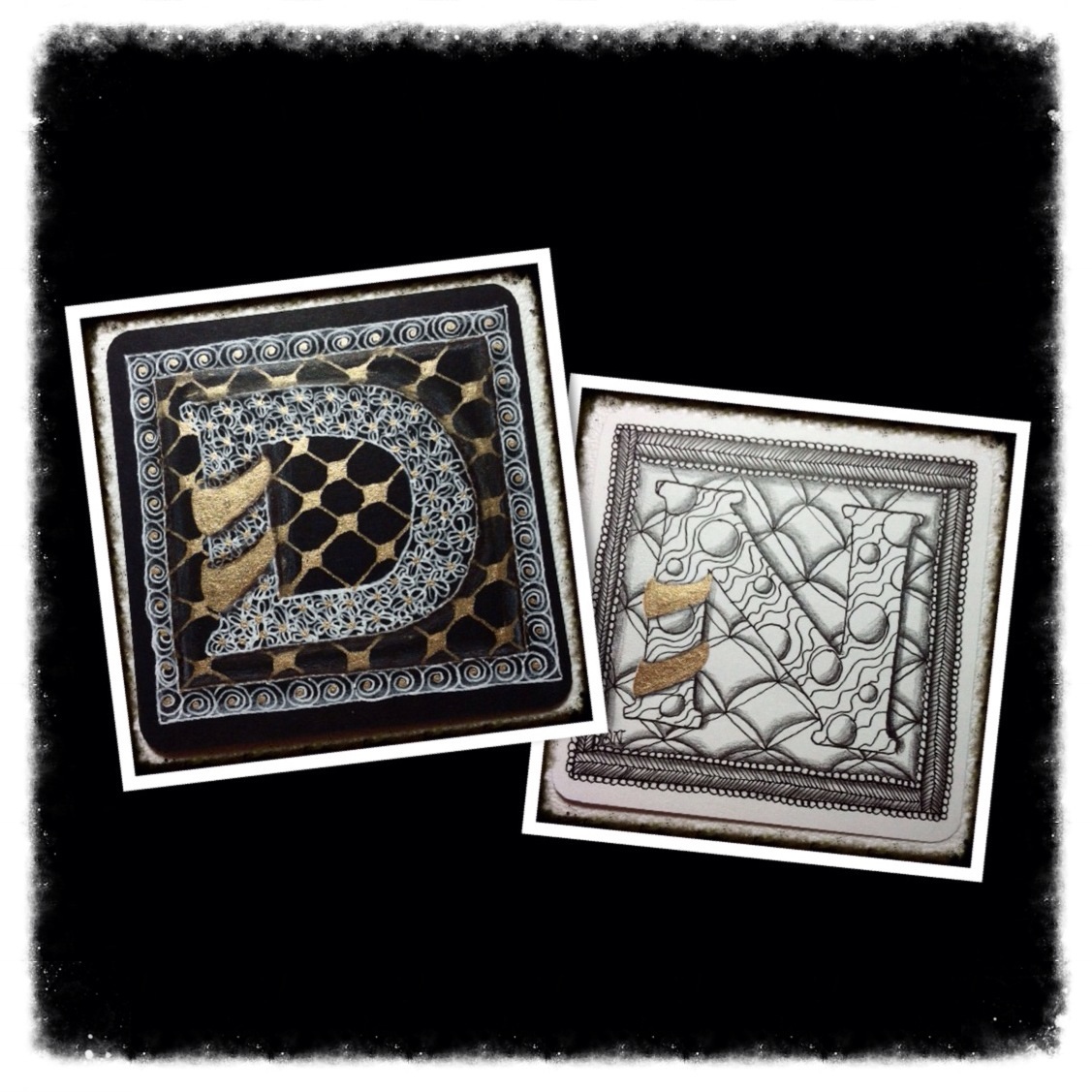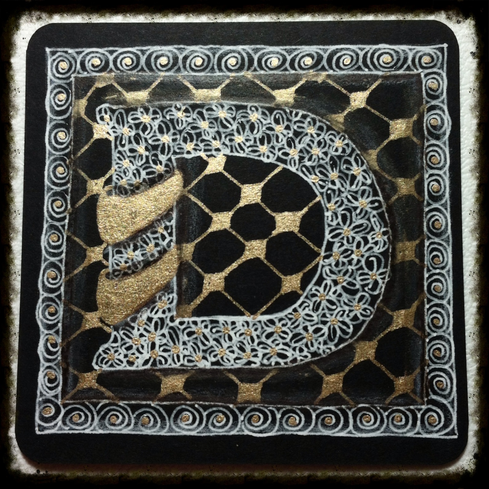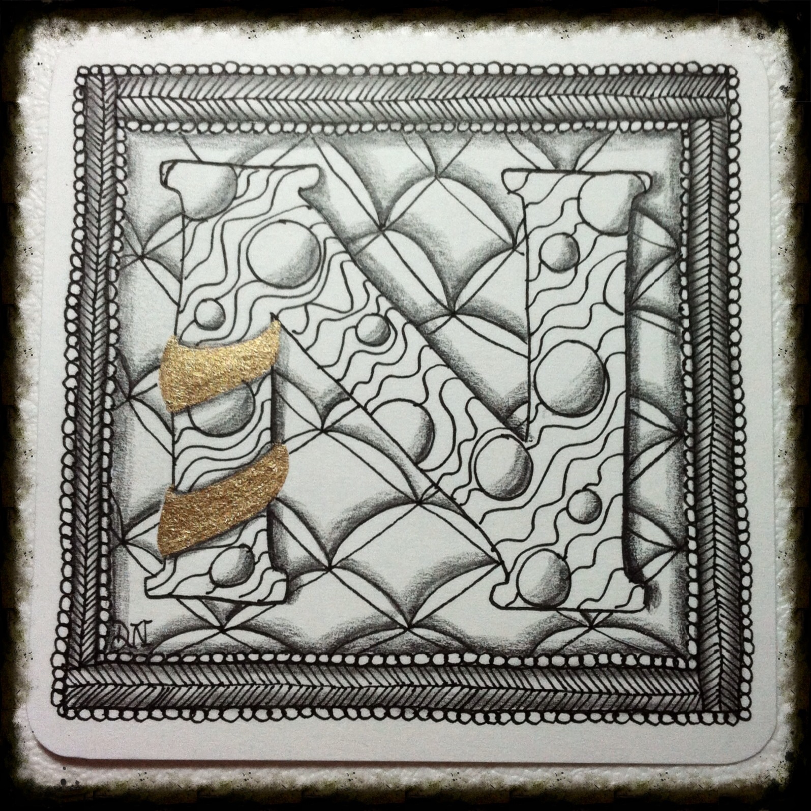 Anyway, I really loved using letters as outlines that I decided to make two tangles! The first tile created was on black paper using opaque Gellyroll pens from Sakura. Using white and gold pens together in this tile is what makes this creation POP!