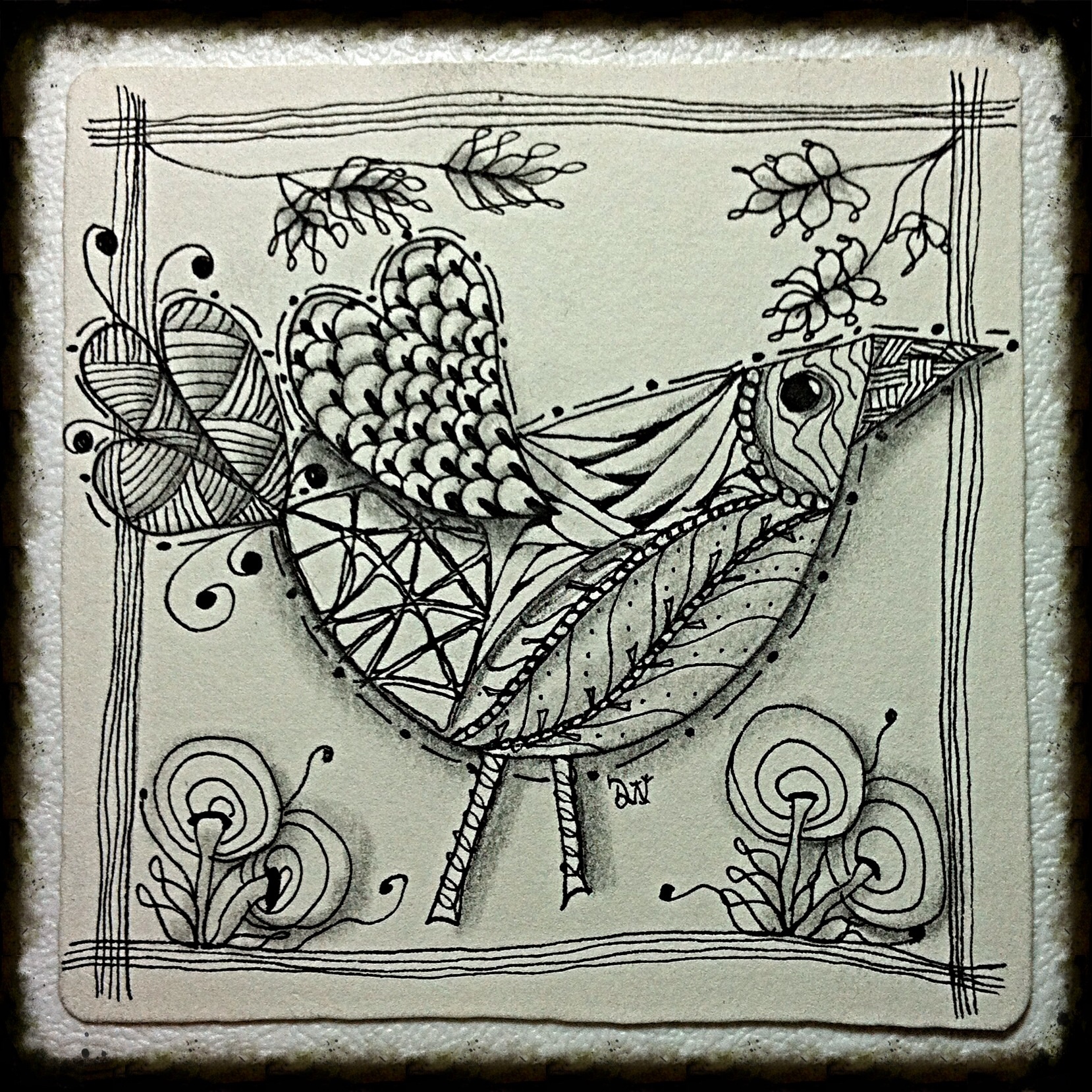 Oh what fun today’s creation was! Today’s challenge was to take a familiar shape and break some boundaries! I decided for this tile that I would use a cute little bird shape. Once that was decided, I filled in my bird with all sorts of tangles: “Tagh”, “Tat”, “Finery”, “Betweed”, “Nekton”, “Sedgling”, “Fesu”, “ “NZeppel”, “Shattuck”, and “Eke”. To have my bird break some boundaries, I added a simple crisscrossing border around the edges. For some finishing touches, I added spring-like tangles like Sedgling, Fescu, and Tat. Shading was a must for this creation since it added so much depth and character to my little bird.