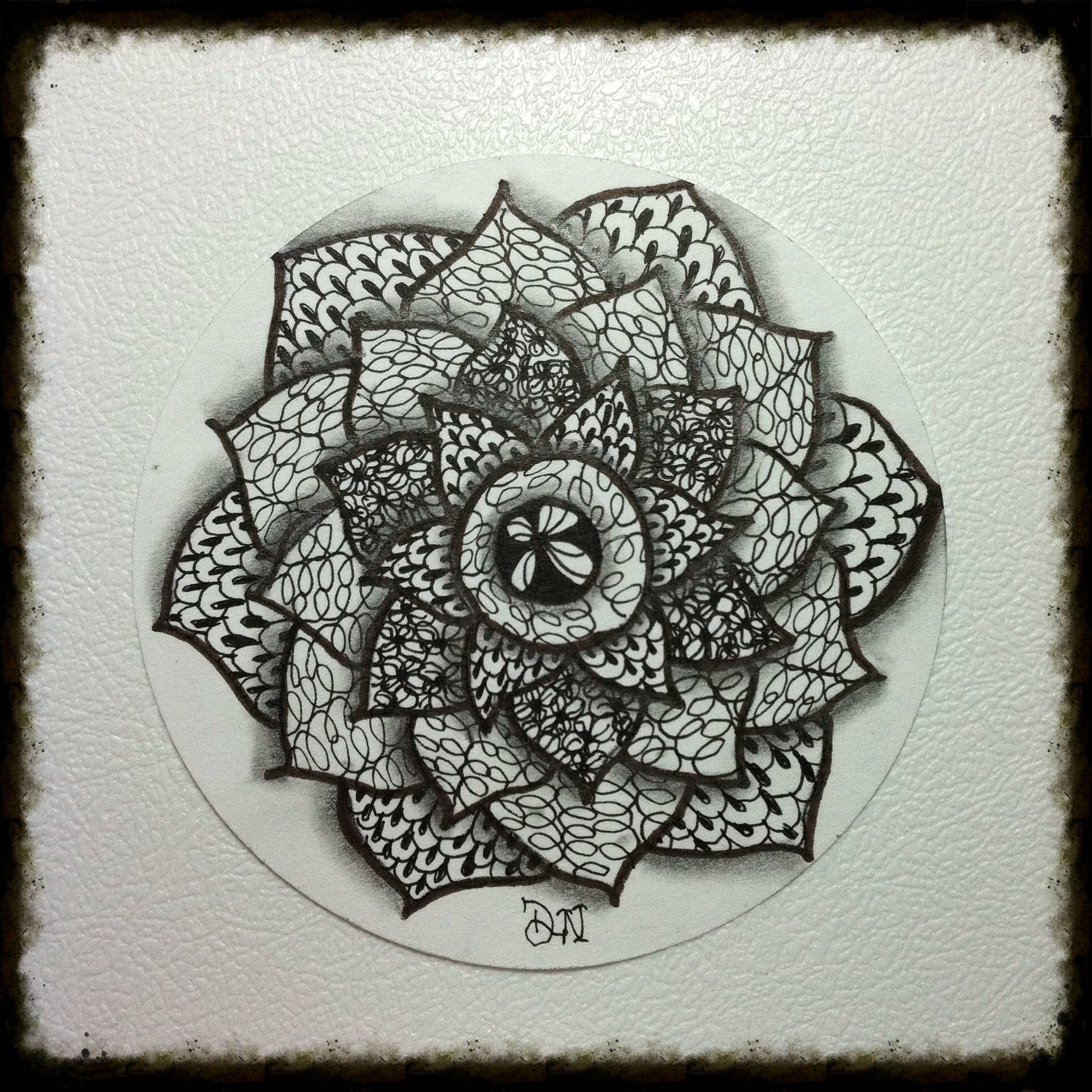 What is a “Zendala” you ask? Well, a Zendala is inspired by the traditional Mandala graphic design which symbolizes the universe. A mandala is divided into for different sections with patterns that repeat themselves. The Zendala version is very similar but rather than using traditional symbolic imagery a Zendala uses tangles! A blank Zendala template was provided to get you familiar with using tangles in a Zendala. The provided Zendala template has a very organic feel to it, so I decided that using organic style tangles would complement this template the best.
