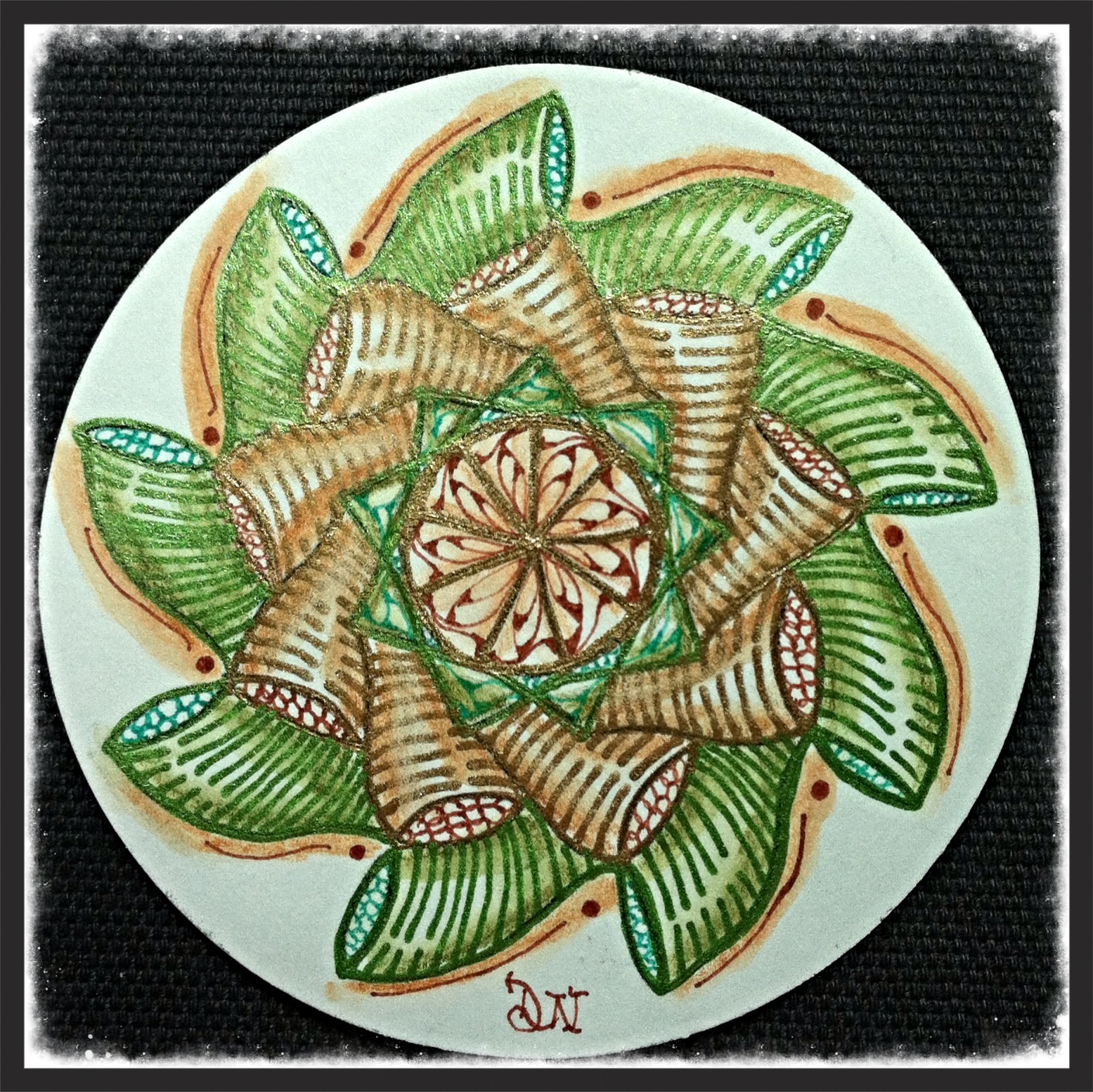 To start this tile, I knew I wanted to use color, so I brought out my relatively new Gelly Roll Sakura pens and started tangling away. I began with a favorite tangle call Isochor and added Tipple to the smaller open areas. I then used my absolute favorite tangle Betweed for the center area. For shading I used my Derwent Inktense pencils and added water to each area to awaken the ink.