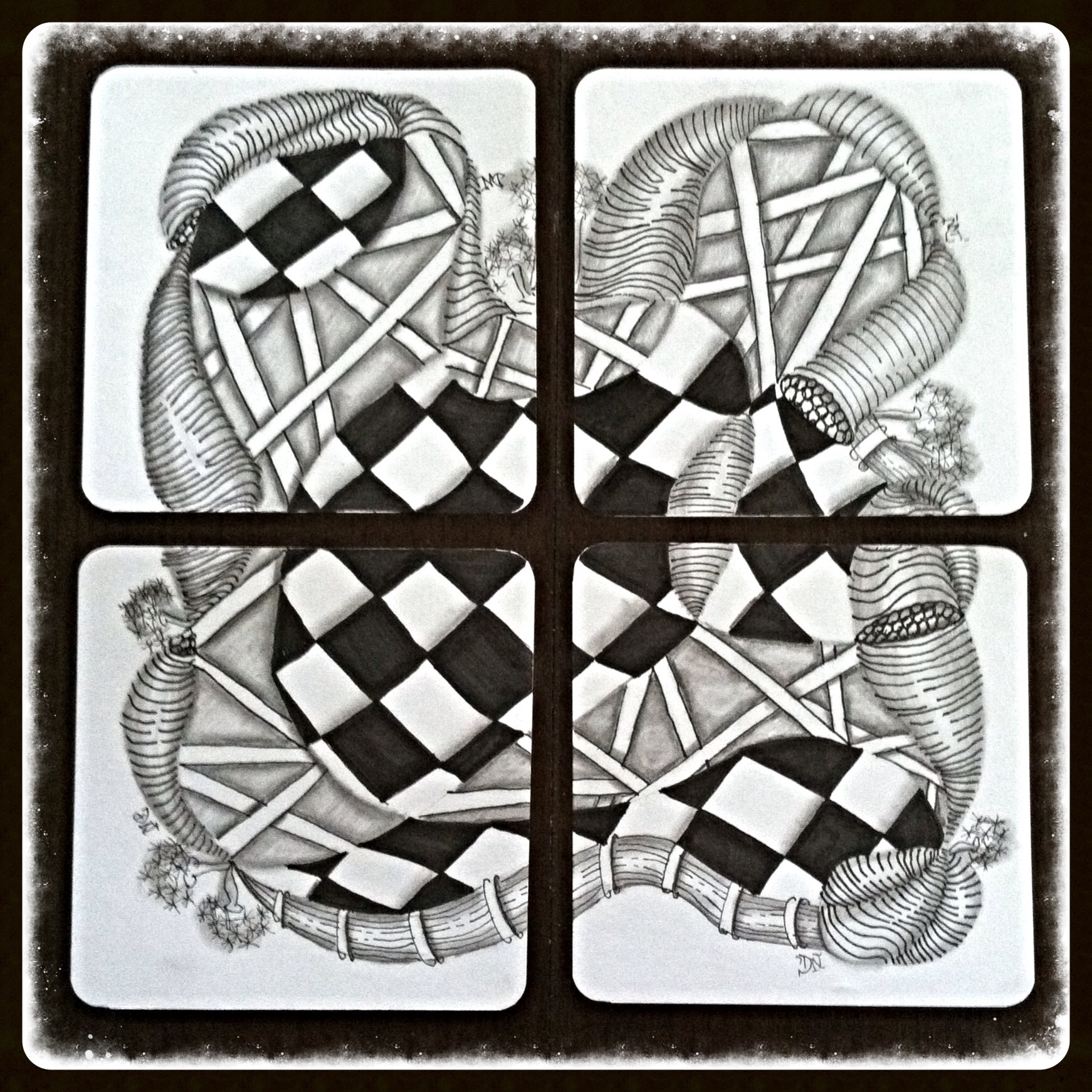 To start, I used temporary glue dots under each tile and placed them side-by-side to keep from moving around too much as I drew ‘string’ across all the tiles. I then proceeded to fill each area of the individual areas of all the tiles and was careful to carry tangle patterns over to the next tile. In selecting my tangles, I was encouraged by the book to use two somewhat new tangles “Zander” and “Stickers”. Stickers was an entirely new tangle for me to learn, but Zander was something that I used in the past when I first began tangling. Since this was my first ensemble group, I wanted to keep the accompanying tangles I used to be very simple. I choose easy tangles like Knightsbridge, Holibough and Isochor to fill in the larger areas and filled in smaller areas with Tipple. To finish, I took the most time to shade each area to give illusion of depth and character.