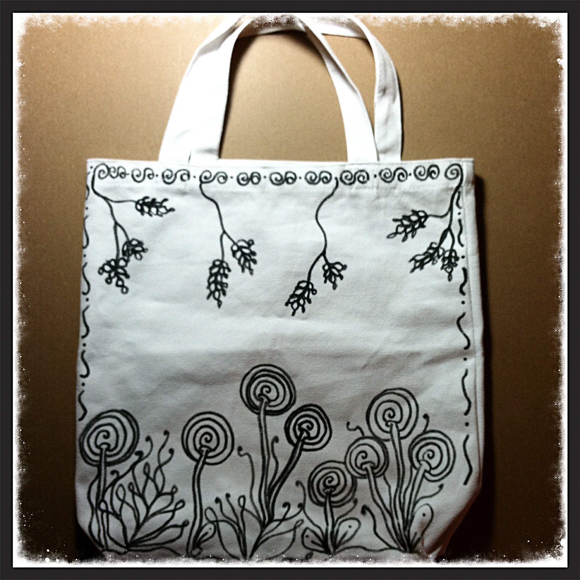 First off, I needed some fabric to tangle on, so I headed over to my local craft store to scope out what my choices were. I landed on a cute basic white canvas bag which I thought would be perfect to tangle on. Second, I needed something that would easily draw onto the fabric and also be washable. After looking around the fabric section, I picked out a black permanent marker that was design to go right onto the fabric. How awesome is that? Now I was ready to roll!