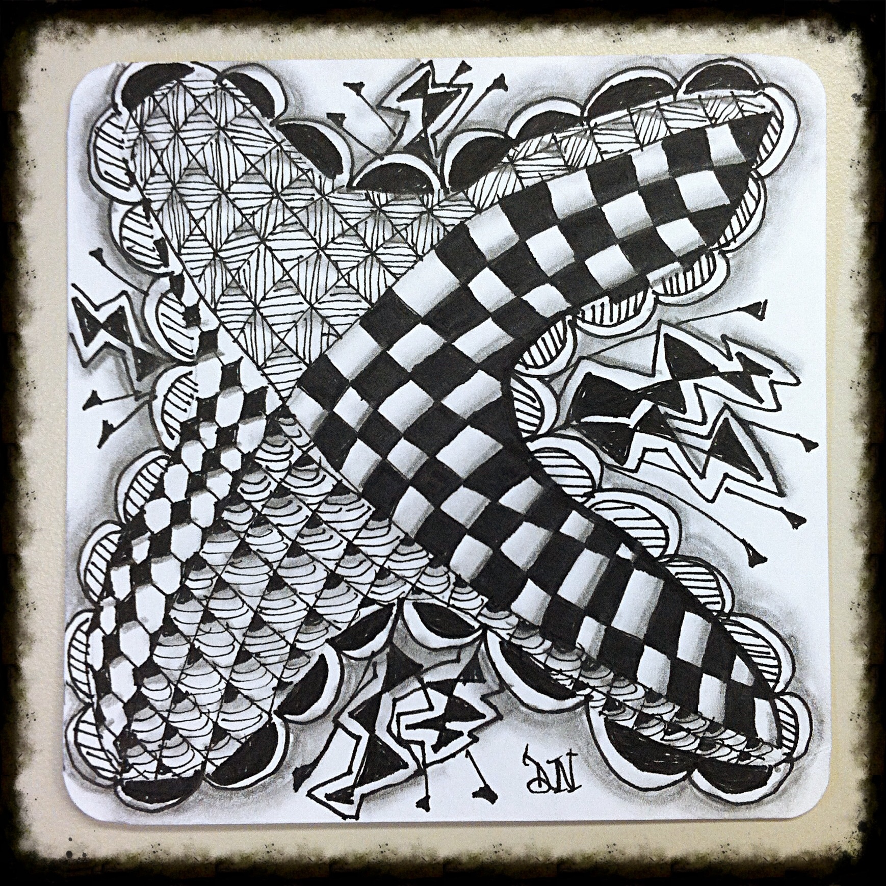 We eventually managed to get things under control where we could somewhat relax through the evening. To calm down from the bee invasion, I managed to create another Zentangle tile. Upon reflection, I think the bees had an influence on what tangles I chose for my drawing that day. There definitely seems to be a buzz-like theme to my tile – what do you think?